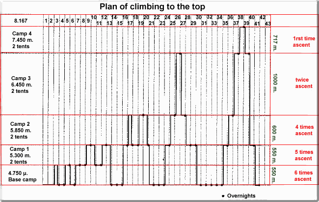 | 4rth camp: 7.450 to the top 8.167 m. From the 4rth camp we move to the right, 40o, we avoid some rocks a little after and we then move to the left, 45o, till the start of the slope, at 7.900 m. There is here also a danger of snow layer unsticking, and the danger of one being swept away if one hasn't got the time to secure oneself. There are no stable ropes at this part of the track, as well as at the former one. From 7.900 m. we follow the slope to the right and after a while we arrive to the top. Total duration: approx. 8 hours. Return to the 4rth Camp after approx. 6 hours. |