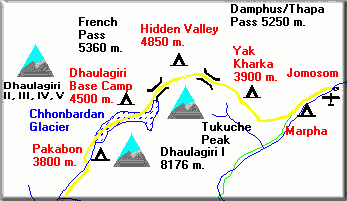 | 23.3.98: The vertical path along a difficult mountain slope continues. We go around the mountain slope to another bivouak cave like the one at Yak Kharka. As we mount to the Thapa peak, the gradient diminishes. We then ascent to the Thapa Pass and a little later to the Hidden Valley (4.915. m.) Dhaulagiri I is hidden by the Tukuche Peak (6.920 m.). Trekking 5 hours. |